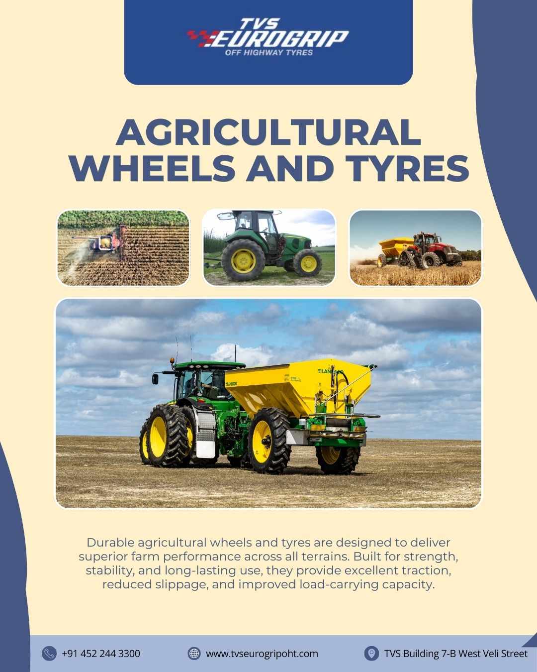 Long-lasting agricultural wheels and tyres are designed to meet the demands of modern farming with exceptional durability and performance. Engineered for tractors, trailers, and implements, they provide superior traction, stability, and load-bearing capacity on all terrains. Their robust construction reduces wear and tear, minimizes downtime, and ensures efficient operations, helping farmers achieve higher productivity and consistent results season after season.